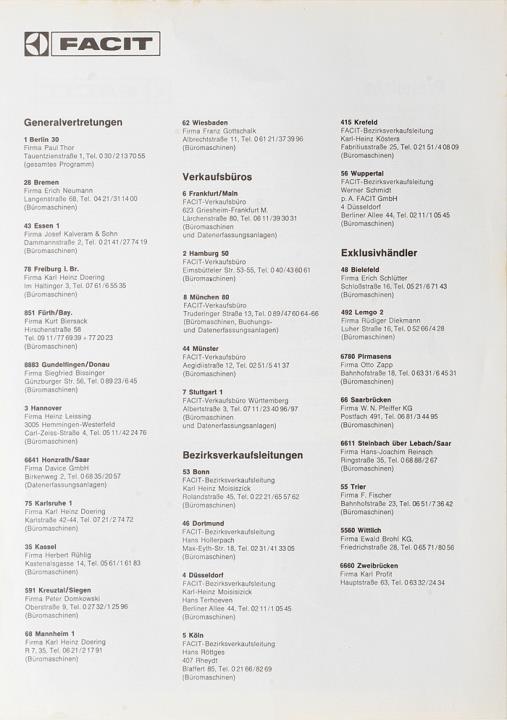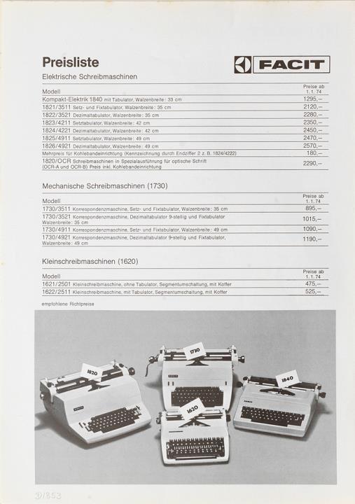 Preisliste für Schreibmaschine Facit Stand 01.01.1974