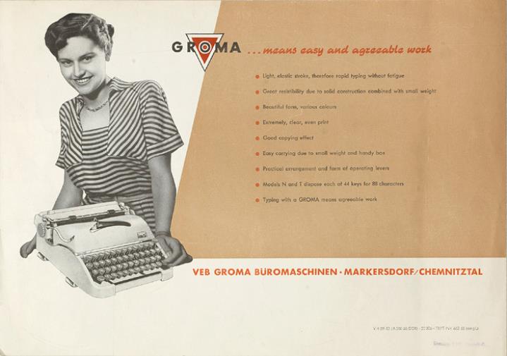 Faltprospekt für Schreibmaschine Groma N und Groma T Nr. 663/55 (engl.)