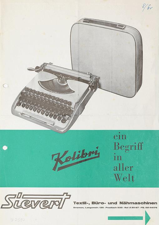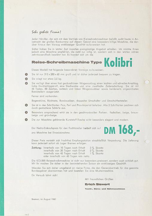 Prospekt für Schreibmaschine Groma Kolibri Nr.860/Z