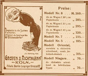 Werbeanzeige mit Preisliste für Schreibmaschine Blickensderfer monochrom Grafik: OMS