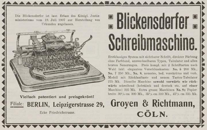 Werbeanzeige für Schreibmaschine Blickensderfer monochrom