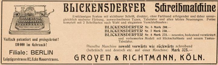 Werbeanzeige für Schreibmaschine Blickensderfer monochrom, zwei Exemplare