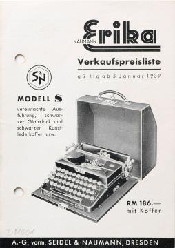 Preisliste für Schreibmaschine Erika gültig ab 5. Januar 1939 Nr. Sv 5451 t pi TE