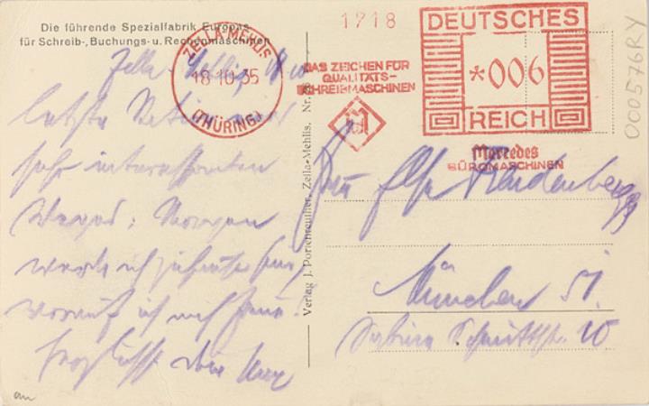 Illustrierte Postkarte; Fotografie, monochrom Rückseite: Stadt-/Landschaftsaufnahme mit Ansicht der Mercedes Büromaschinenwerke Vorderseite: beschrieben, adressiert; Absenderfreistempel: datiert Zella-Mehlis/18.10.1935, Werbung Mercedes, Wert Deutsches Reich 6 RPf.