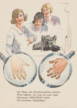 Werbepostkarte; Grafik, polychrom; Nr. 1120/9 Vorderseite: drei Sekretärinnen mit elektrischer Schreibmaschine Mercedes, zwei Lupen zeigen vergrößerte Hände; Werbetext in Versform Rückseite nicht beschrieben