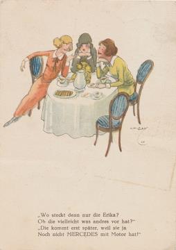Werbepostkarte; Grafik, polychrom; Nr. 1120/12 Vorderseite: drei Frauen/Sekretärinnen beim Kaffeekränzchen; Werbetext in Versform Rückseite: beschrieben, adressiert; Briefmarke Deutsches Reich 5RPf.+5 RPf.; Poststempel Augsburg/12.8.1927
