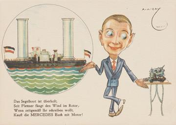 Werbepostkarte; Grafik, polychrom; Nr. 1120/14 Vorderseite: Mann mit elektrischer Schreibmaschine Mercedes, Rundbild mit Dampfer; Werbetext in Versform Rückseite nicht beschrieben