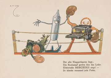Werbepostkarte; Grafik, polychrom; Nr. 1120/16 Vorderseite: Boxringszene; elektrische Schreibmaschine Mercedes besiegt eine mechanische Schreibmaschine, Schreibfeder als Schiedsrichter; Werbetext in Versform Rückseite nicht beschrieben