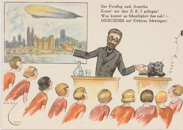 Werbepostkarte; Grafik, polychrom; Nr. 1120/17 Vorderseite: Lehrer/Vortragender mit elektrischer Schreibmaschine Mercedes vor einer Gruppe Studentinnen, im Hintergrund Bild eines Zeppelins; Werbetext in Versform Rückseite nicht beschrieben