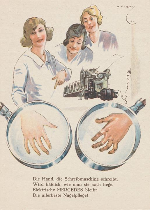Werbepostkarte; Grafik, polychrom; Nr. 1120/9 Vorderseite: drei Sekretärinnen mit elektrischer Schreibmaschine Mercedes, zwei Lupen zeigen vergrößerte Hände; Werbetext in Versform Rückseite nicht beschrieben