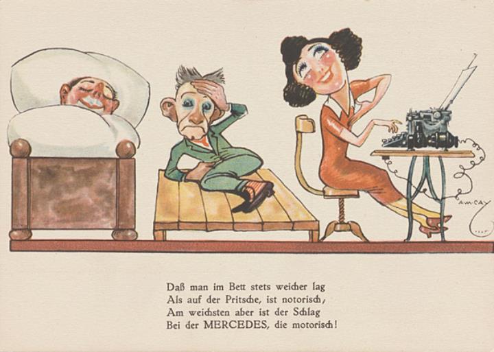 Werbepostkarte; Grafik, polychrom; Nr. 1120/19 Vorderseite: Mann in einem Bett und auf einer Pritsche, daneben Sekretärin mit elektrischer Schreibmaschine Mercedes; Werbetext in Versform Rückseite nicht beschrieben