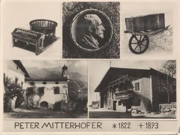 Illustrierte Postkarte; Fotocollage, monochrom Rückseite: sechs Ansichten zu Peter Mitterhofer und seiner Schreibmaschine Vorderseite mit Text: 130. Commemorazione / Gedenkfeier 18.5.1952; nicht beschrieben