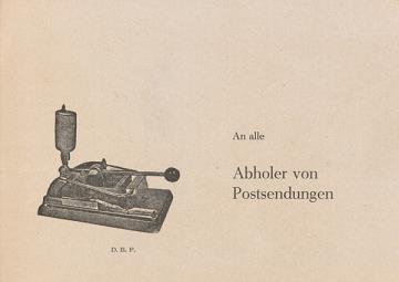 Werbepostkarte; Grafik, monochrom Rückseite mit Werbetext Vorderseite: adressiert An alle Abholer von Poststendungen