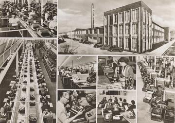 Illustrierte Postkarte; Fotocollage, monochrom; Nr. 1/02/030/02 Rückseite: acht Kleinansichten der Olympia Büromaschinen Werke Wilhelmshaven Vorderseite nicht beschrieben