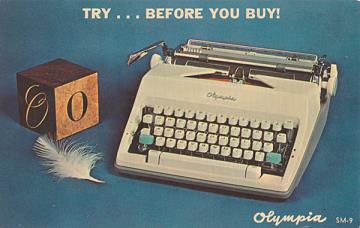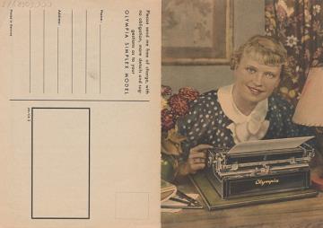 Werbepostkarte; Fotografie, polychrom; Nr. 88343-B Rückseite: Schreibmaschine Olympia neben Würfel und Feder Vorderseite: Werbetext; nicht beschrieben