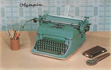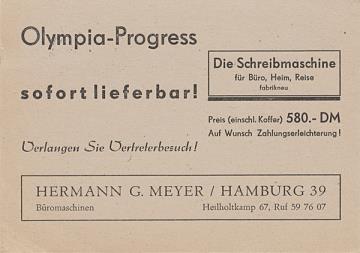 Werbepostkarte; Fotografie, polychrom; Nr. 1901B Rückseite: Schreibmaschine Olympia neben Bürobedarf Vorderseite: Werbetext; adressiert an Frank Evans, Pottstown; Briefmarke U.S. Postage 3c; Poststempel Pottstown/Dec 1 1958