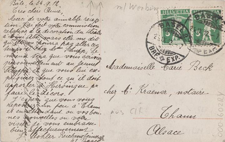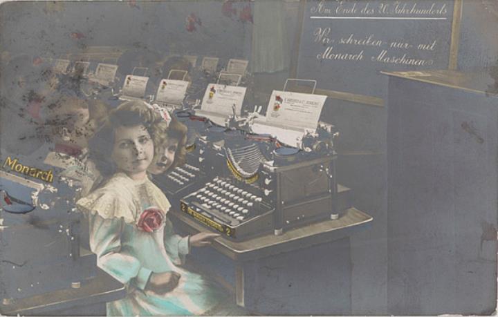 Illustrierte Postkarte; Fotografie, koloriert Rückseite: zwei Mädchen mit Schreibmaschinen Monarch, im Hintergrund weitere Kinder Vorderseite: beschrieben, adressiert; Briefmarke Helvetia 5+5 Rp.; Poststempel Basel/24 IX 1912