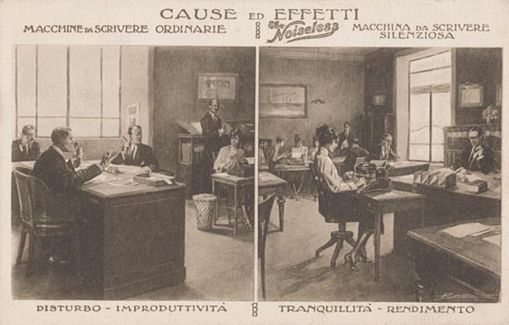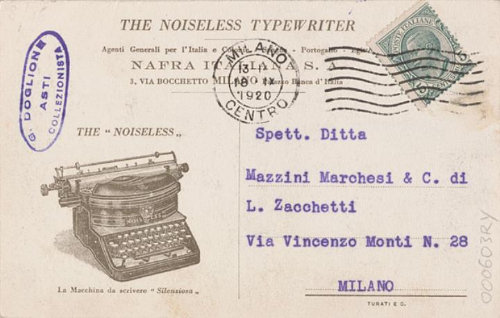 Werbepostkarte; Grafik, monochrom Rückseite: zwei Büroszenen; mit gewöhnlicher "lauter" Schreibmaschine / mit "leiser" Schreibmaschine Noiseless Vorderseite: Werbung Noiseless; adressiert an Ditta Mazzini Marchesi, Milano; Briefmarke Poste Italiane 5 centesimi; Poststempel Milano/18 IX 1920