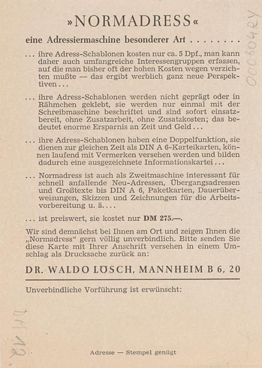 Next to literature on the history of technology, of the typewriter and the office, the Archive holds patent letters, textbooks and instruction manuals as well as historical postcards, letters, photographs and various kinds of advertising (leaflets and brochures, advertising stamps, newspaper ads, posters and signs, promotional gifts).