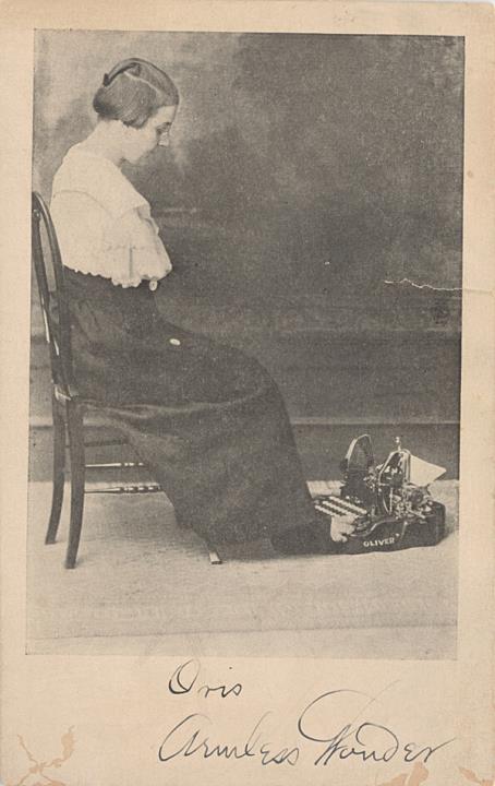 Illustrierte Postkarte; Fotografie, monochrom Rückseite: Frau ohne Arme mit Schreibmaschine Oliver Vorderseite nicht beschrieben