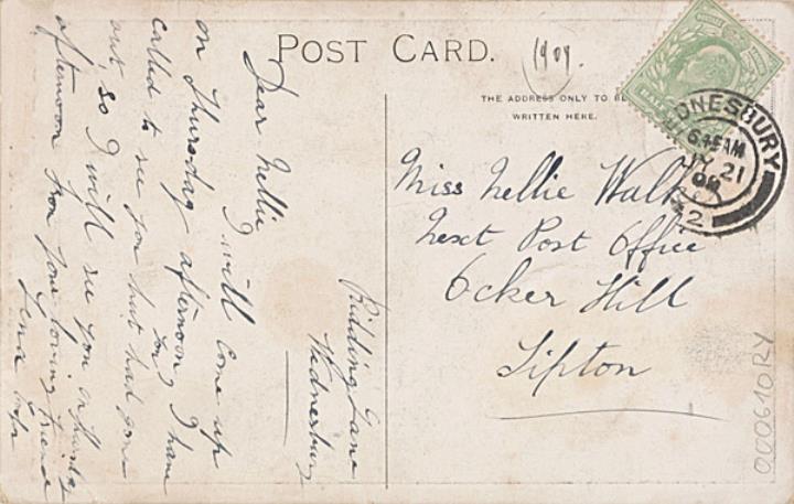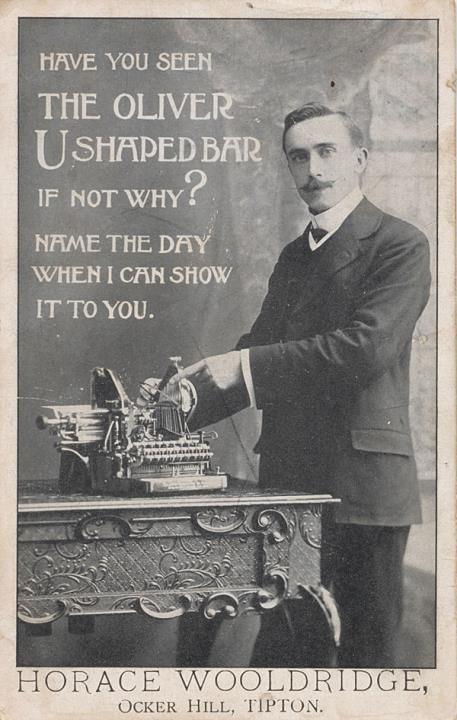 Werbepostkarte; Fotografie, monochrom Rückseite: Mann mit Schreibmaschine Oliver; Bildunterschrift: Horace Wooldridge, Ocker Hill, Tipton Vorderseite: beschrieben; adressiert an Miss Walker, Tipton; Briefmarke Postage Revenue (U.K.) Half Penny; Poststempel Wednesbury/Jy 21 1909