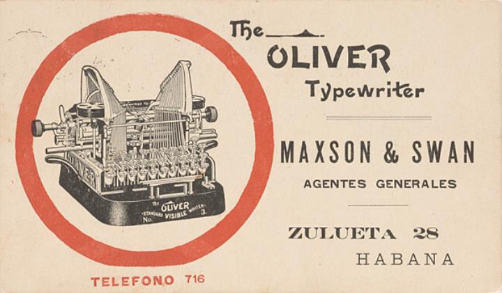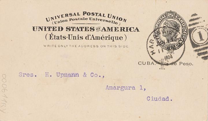 Werbepostkarte Ganzsache; Grafik, polychrom Rückseite: Schreibmaschine Oliver Vorderseite: adressiert an Sres. H. Upmann & Co., Habana; vorgedruckter Postwert U.S. Two Cents; Poststempel Habana/Jun 11 1904