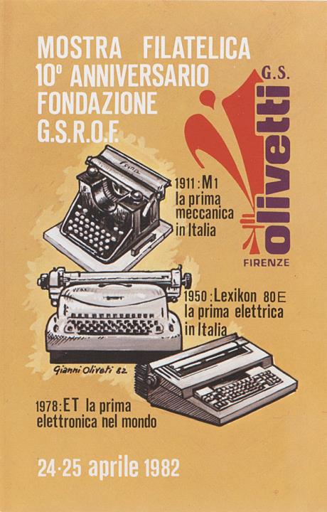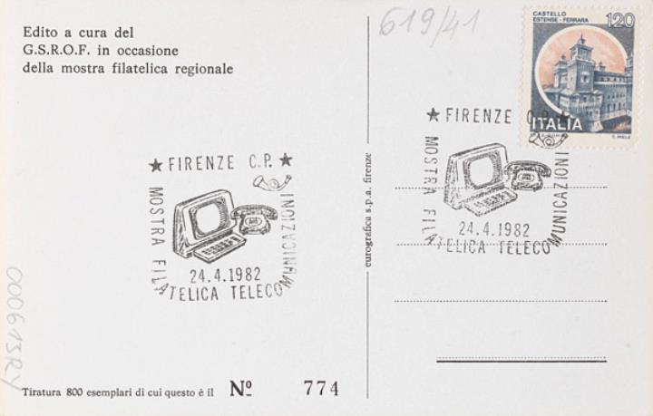 Illustrierte Postkarte, Grafik, polychrom; Nr. 774 Herausgeber: Gruppo Sportivo Ricreativo Olivetti Firenze Rückseite: Schreibmaschinen Olivetti Vorderseite: Briefmarke Italia 120 Lire; zwei Sonderstempel Mostra Filatelica Telecomunicazioni 24.4.1982