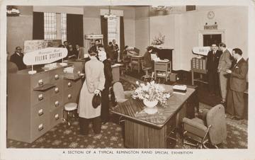 Illustrierte Postkarte; Fotografie, monochrom Rückseite: mehrere Besucher in einem Ausstellungsraum für Büroeinrichtung Remington Rand Vorderseite: beschrieben; adressiert an Mrs. Buckley, Bramcote; Briefmarke Postage Revenue (U.K.) 2d; Poststempel Frinton-on-Sea/28 Jly 1955