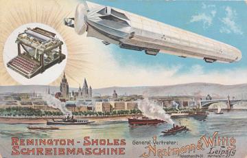 Werbepostkarte; Grafik, polychrom Rückseite: Stadt-/Flussansicht mit Schiffen und Zeppelin, Rundbild mit Schreibmaschine Remington-Sholes Vorderseite: beschrieben, adressiert; Briefmarke Deutsches Reich 5 Pf.; Poststempel Leipzig/15.06.1909