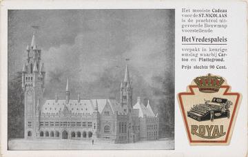 Werbepostkarte; Grafik, monochrom Rückseite: Ansicht Friedenspalast in Den Haag, daneben Werbetext; Siegelmarke für Schreibmaschine Royal (polychrom) nachträglich aufgeklebt Vorderseite nicht beschrieben
