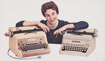 Werbepostkarte; Fotografie, polychrom Rückseite: Frau mit elektrischer Schreibmaschine Smith-Corona, an der Wand hängend zwei goldene Masken Vorderseite: Werbetext; beschrieben, adressiert; Briefmarke U.S. Postage 3c; Poststempel Birmingham/Nov 6 1958