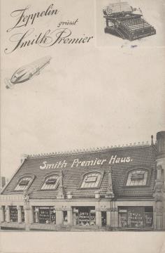 Werbepostkarte; Fotografie, Grafik, monochrom Rückseite: Gebäudeansicht Smith Premier Haus, darüber ein Zeppelin (Zeichnung); rechte obere Ecke mit Bild der Schreibmaschine Smith Premier Vorderseite: beschrieben; adressiert an Herrn Fincke, Rheinsberg; Briefmarke Deutsches Reich 5 Pf.; Poststempel Berlin/23.2.1910