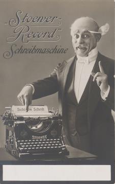 Werbepostkarte; Fotografie, monochrom Rückseite: Mann mit Federkiel hinter dem Ohr und Schreibmaschine Stoewer