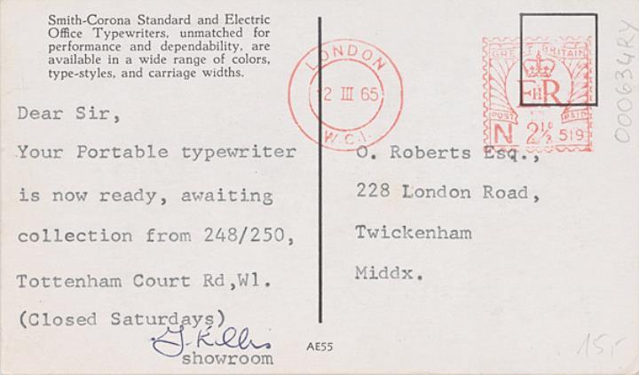 Werbepostkarte; Fotografie, polychrom Rückseite: Frau mit mechanischer und elektrischer Schreibmaschine Smith-Corona Vorderseite: Werbetext; beschrieben; adressiert an O. Roberts, Esq., Twickenham; Freistempel datiert London/2 III 1965, Wert Great Britain 2 1/2 D
