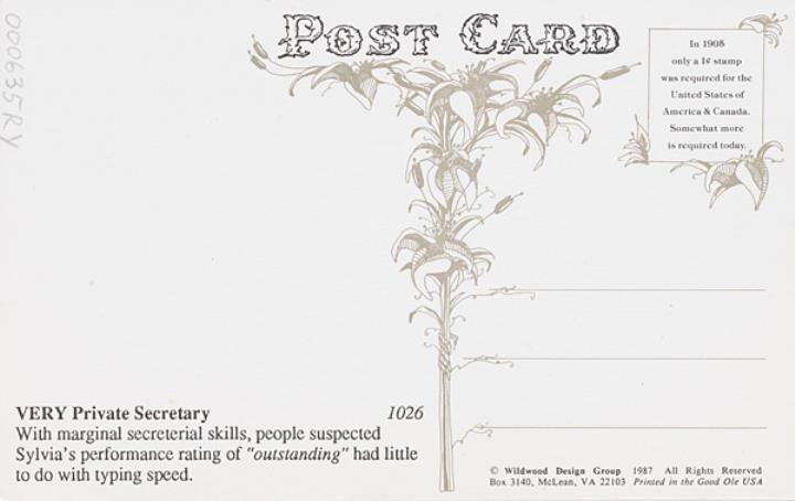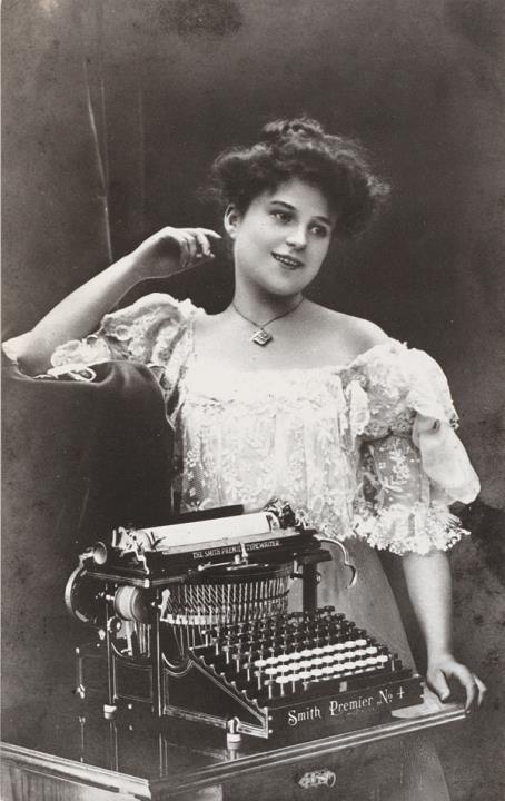 Werbepostkarte, Nachdruck; Fotografie, monochrom Rückseite: Frau mit Schreibmaschine Smith Premier Vorderseite mit Beschreibungstext