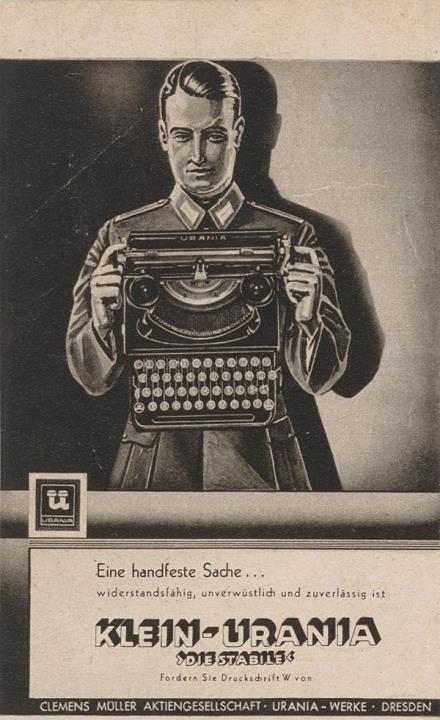 Werbepostkarte; Grafik, monochrom Rückseite: Mann in Uniform mit Schreibmaschine Urania Vorderseite nicht beschrieben
