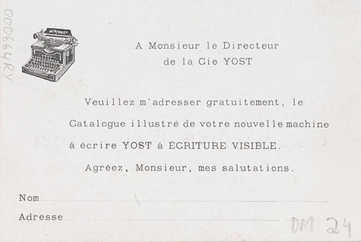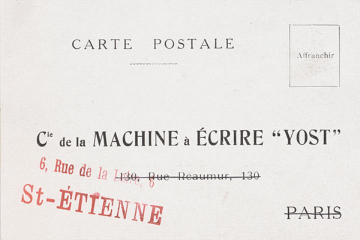 Antwortkarte; Grafik, monochrom Vorderseite: vorgedruckte Anschrift Cie de la Machine à Écrire Yost, Paris/St-Etienne Rückseite: vorgedruckter Bestelltext