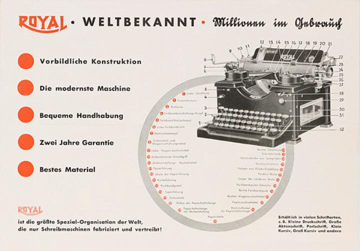 Next to literature on the history of technology, of the typewriter and the office, the Archive holds patent letters, textbooks and instruction manuals as well as historical postcards, letters, photographs and various kinds of advertising (leaflets and brochures, advertising stamps, newspaper ads, posters and signs, promotional gifts).