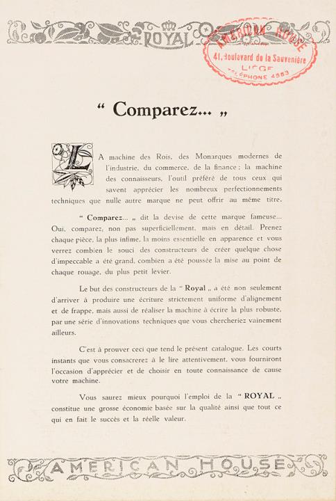 Prospekt in französischer Sprache für Schreibmaschine Royal 10 Umschlag mit vorgestanzter Antwortkarte
