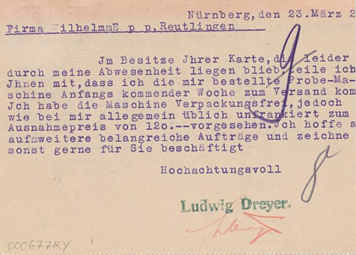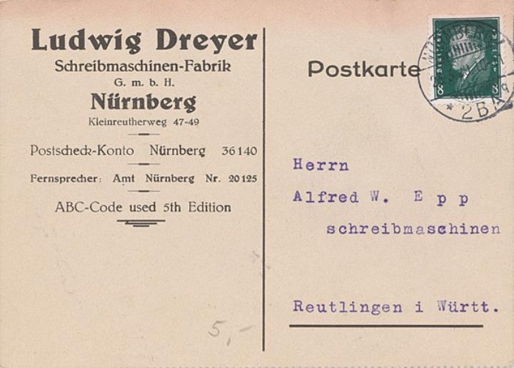 Postkarte mit Firmendruck; monochrom Vorderseite: adressiert an Herr Epp Schreibmaschinen, Reutlingen; Briefmarke Deutsche Reich 8 RPf.; Poststempel Nürnberg/23.3.1929 Rückseite beschrieben (Maschinenschrift)