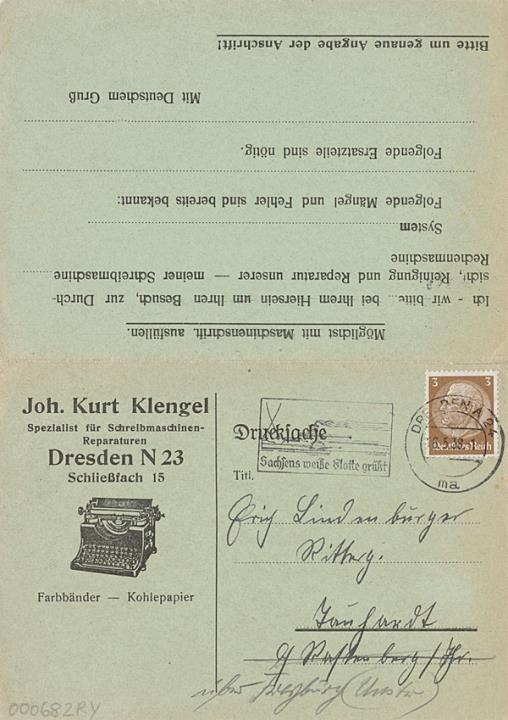 Antwortpostkarte; Grafik, monochrom Werbekarte: Schreibmaschine; adressiert, Briefmarke Deutsches Reich 3 RPf., Poststempel Dresden/6.5.1938 / Informationstext Antwortkarte: vorgedruckte Anschrift / vorgedruckter Anfragetext
