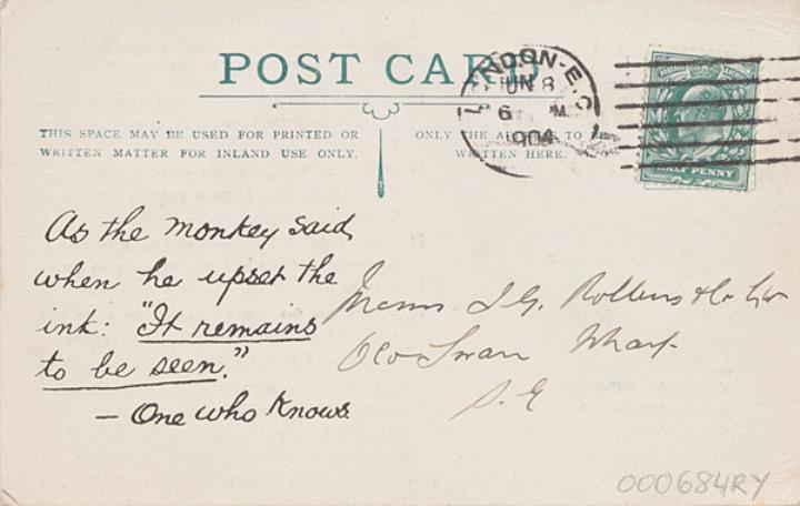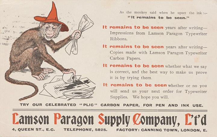 Werbepostkarte; Grafik, polychrom Rückseite: Affe mit Hut und Schreibutensilien, daneben Werbetext Vorderseite: beschrieben, adressiert; Briefmarke Postage Revenue Half Penny; Poststempel London/Jun 8 1904