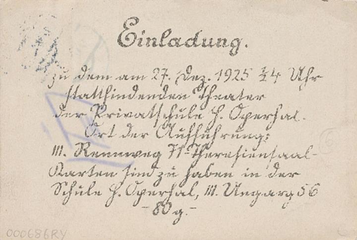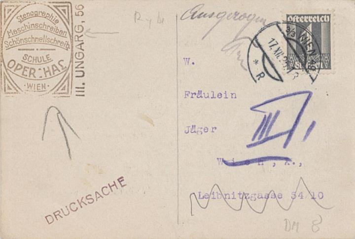 Illustrierte Postkarte; Grafik, monochrom Vorderseite: Firmenstempel; adressiert an Fräulein Jäger, Wien; Briefmarke Österreich 1 Groschen; Poststempel Wien/17 XII 1925 Rückseite mit vorgedruckter Einladung