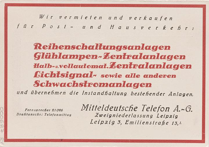 Werbepostkarte; Grafik, polychrom Vorderseite: Abbildung Tischtelefon; adressiert an Herrn Käppler, Leipzig; Freistempel datiert Leipzig/14.4.1925, Wert Deutsches Reich 3 RPf. Rückseite mit vorgedrucktem Werbetext