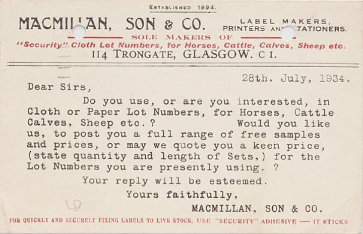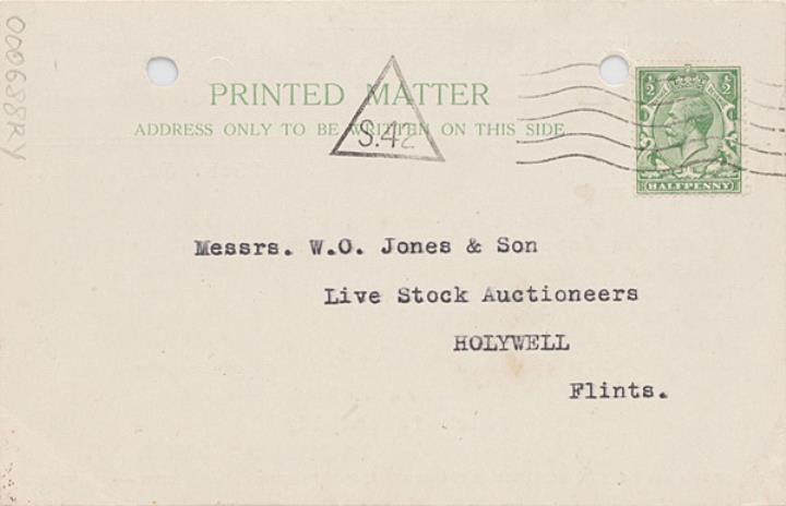 Werbepostkarte; polychrom Rückseite: Firmendruck; Werbetext in Maschinenschrift Vorderseite: adressiert an Messrs. Jones & Son, Holywell; Briefmarke Postage Revenue Half Penny