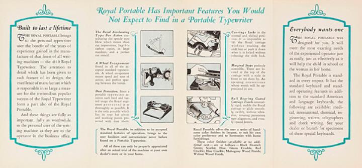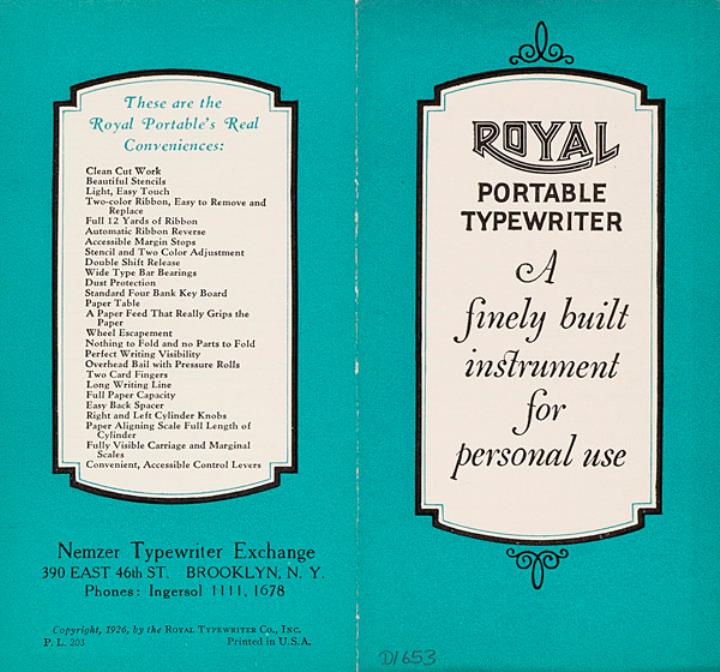 Faltprospekt für tragbare Schreibmaschine Royal Portable A finely built instrument for personal use Nr. PL203