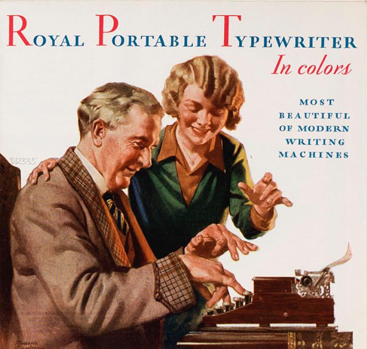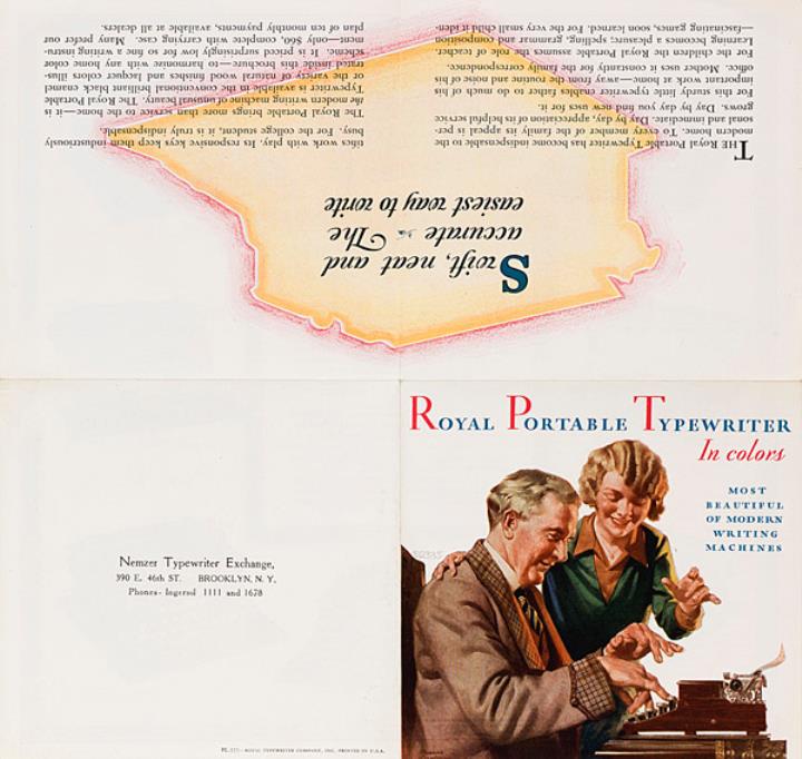 Faltprospekt für tragbare Schreibmaschine Royal Portable most beautiful of modern writing machines Nr. PL222 Grafik: Frederic Stanley