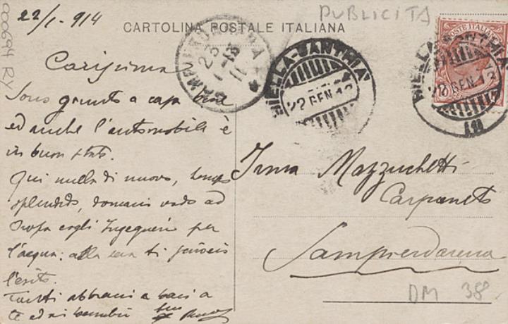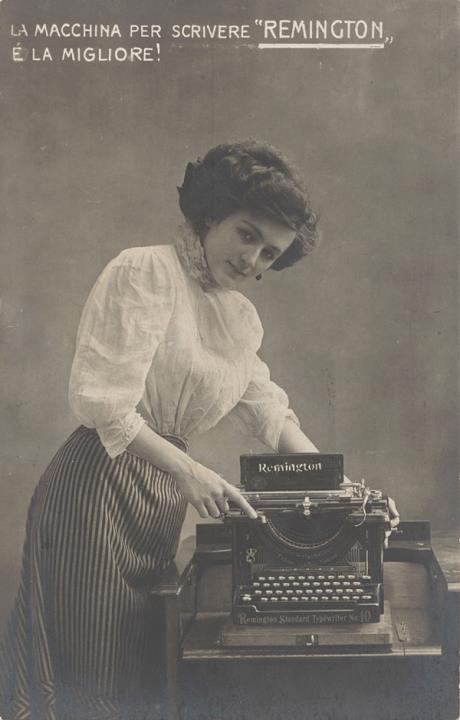 Werbepostkarte; Fotografie, monochrom Rückseite: Frau mit Schreibmaschine Remington Vorderseite: beschrieben; adressiert an Sig.ra Mazzuchetti, Sampierdarena; Briefmarke Poste Italiane 10 centesimi; Poststempel Biella/22.01.1913