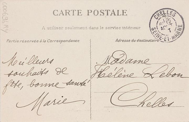 Werbepostkarte; Fotografie, monochrom; Nr. I.B.C.-5 Rückseite: vier Frauen mit Stenografiermaschinen; weiterer Text: Leçons de Sténographie mécanique Vorderseite: beschrieben; adressiert an Madame Lebon, Chelles; Poststempel -Chelles/17 Aout 19xx