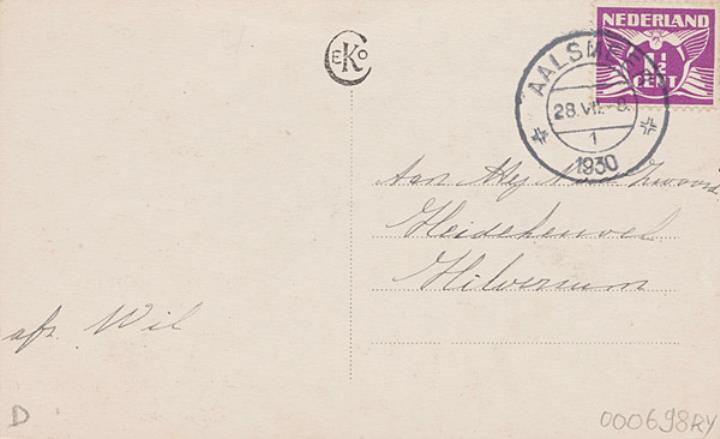 Illustrierte Postkarte; Fotografie, monochrom; Serie Ceko 1819 Rückseite: Frau mit Schreibmaschine, Blumen als Dekoration Vorderseite: beschrieben, adressiert; Briefmarke Nederland 1 1/2 Cent; Poststempel Aalsmeer/28 VII 1930